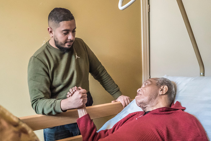 Azzaoui (30) en meneer Conner hebben iets samen. Ze snappen elkaar. De sterke stoere jongeman en de fragiele, bedlegerige senior. Als Azzaoui naast zijn bed staat, grijpt Conner zijn hand en werpt hem een warme blik toe.